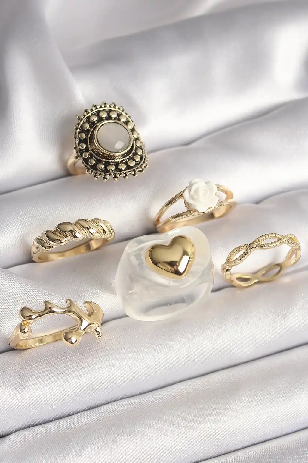 Pirinç Gold Renk Beyaz Gül Figür Kalp İşlemeli Sarmal Detay 6'Lı Kadın Yüzük Seti