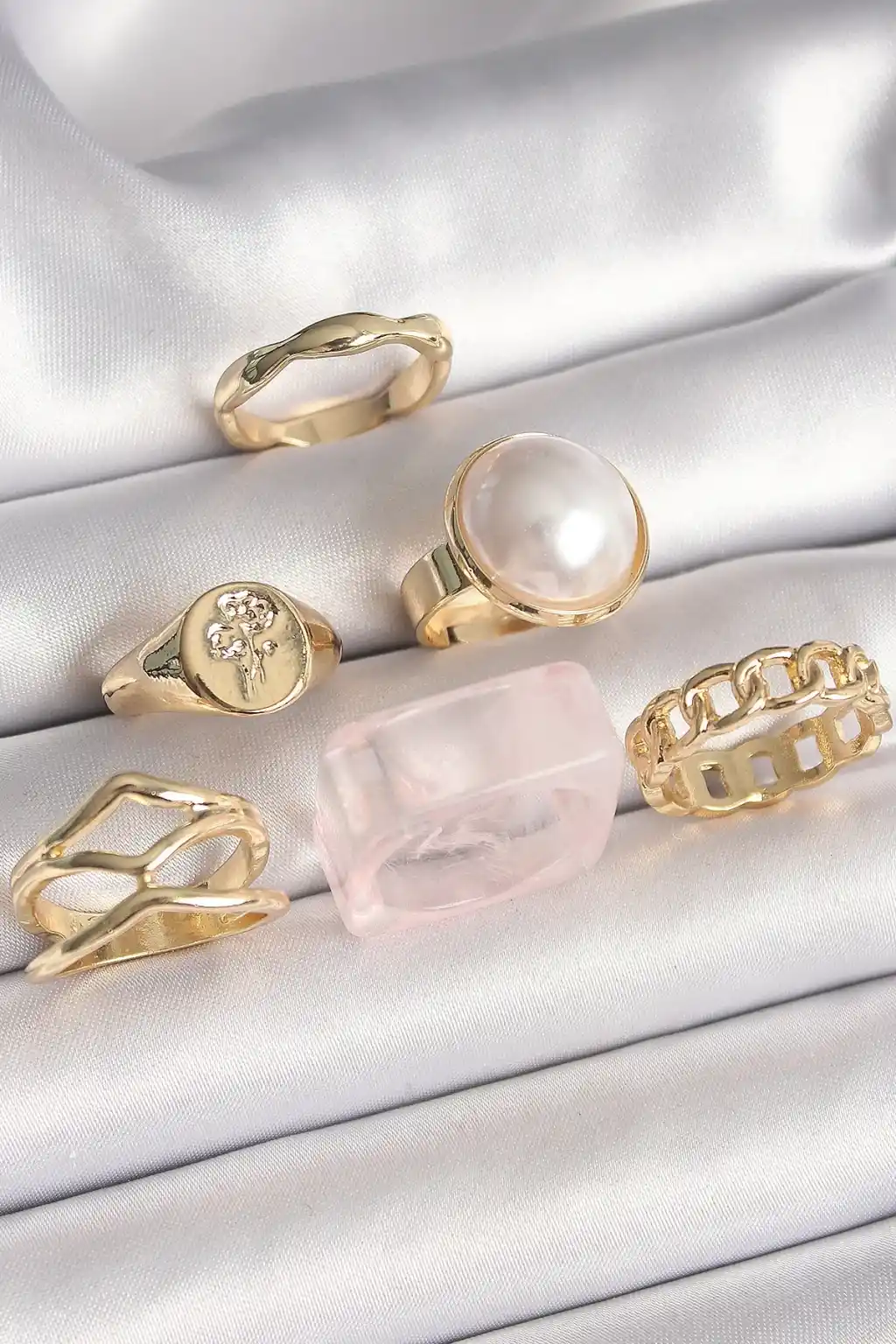 Pirinç Gold Renk Beyaz İncili Zincir Yüzük Figür İşleme Detay 6'Lı Kadın Yüzük Seti