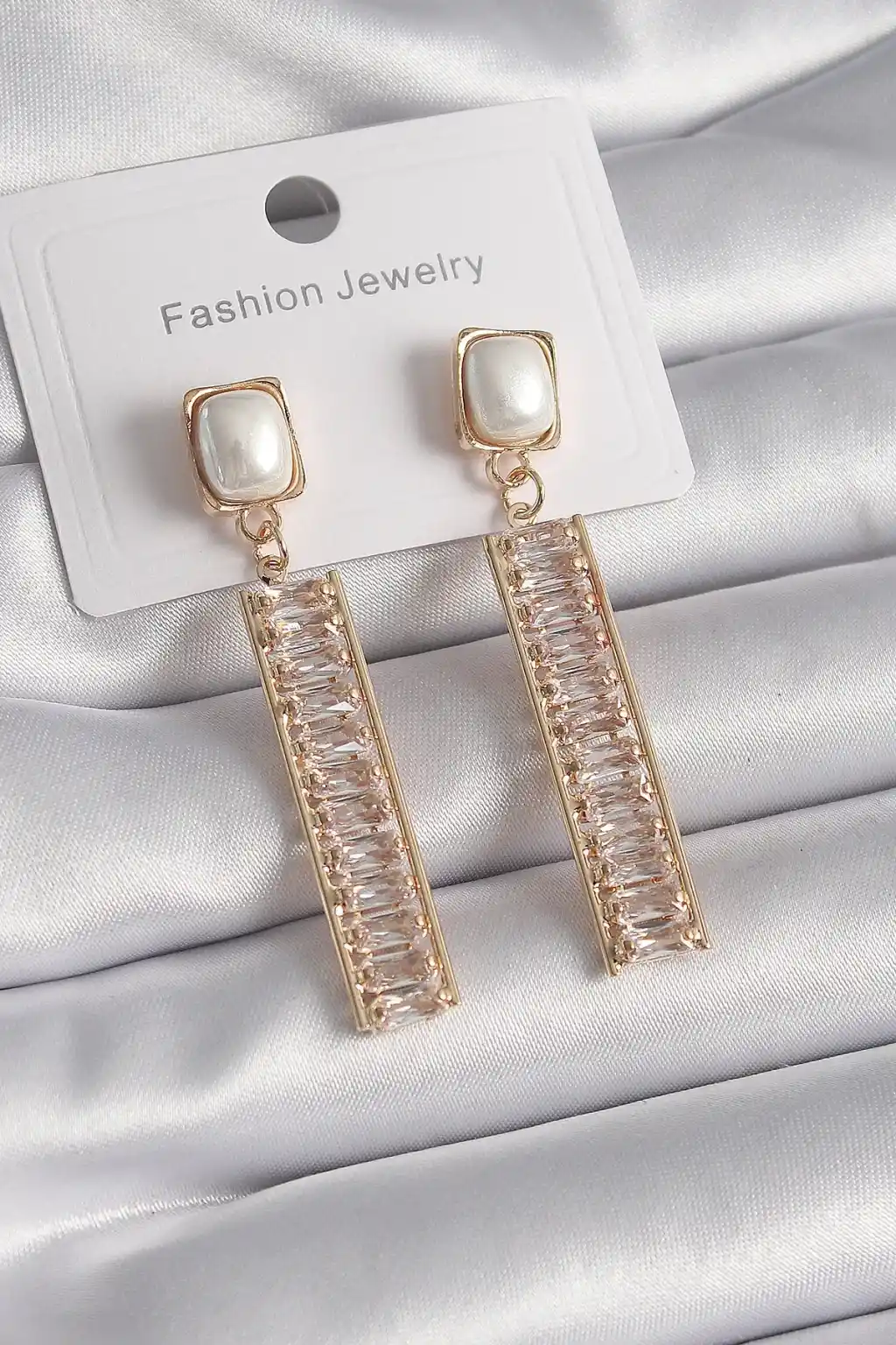 Pirinç Gold Renk Kare İnci Zirkon Taşlı Su Yolu Model Kadın Küpe