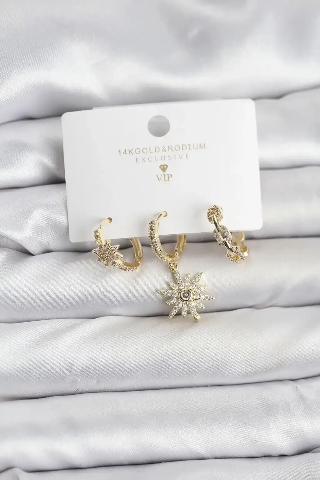 Pirinç Gold Renk Kutup Yıldızı Model 3'lü Kadın Küpe Seti