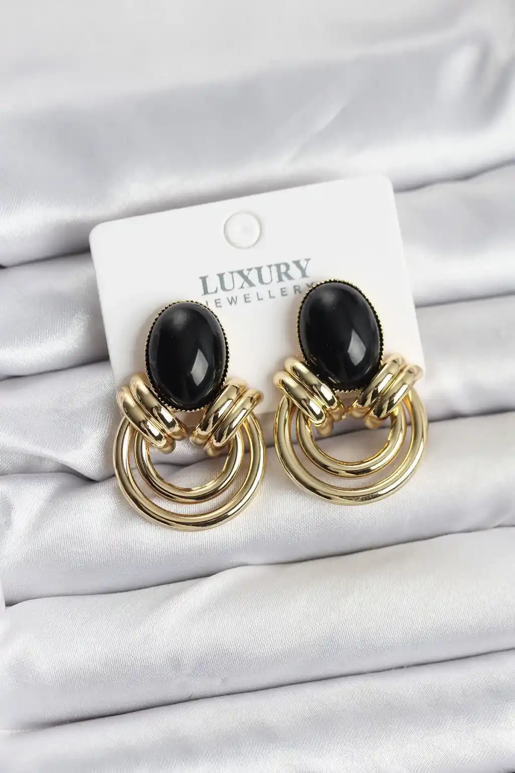 Pirinç Gold Renk Siyah Taşlı Vintage Kadın Küpe