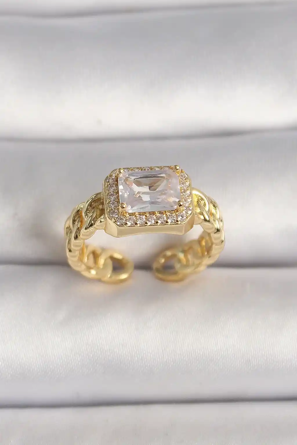 Pirinç Gold Renk Zincir Model Kare Zirkon Taşlı Kadın Yüzük