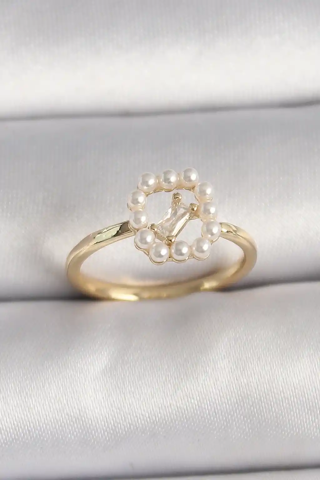 Pirinç Gold Renk Zirkon Taş Detaylı İncili Ayarlanabilir Yüzük