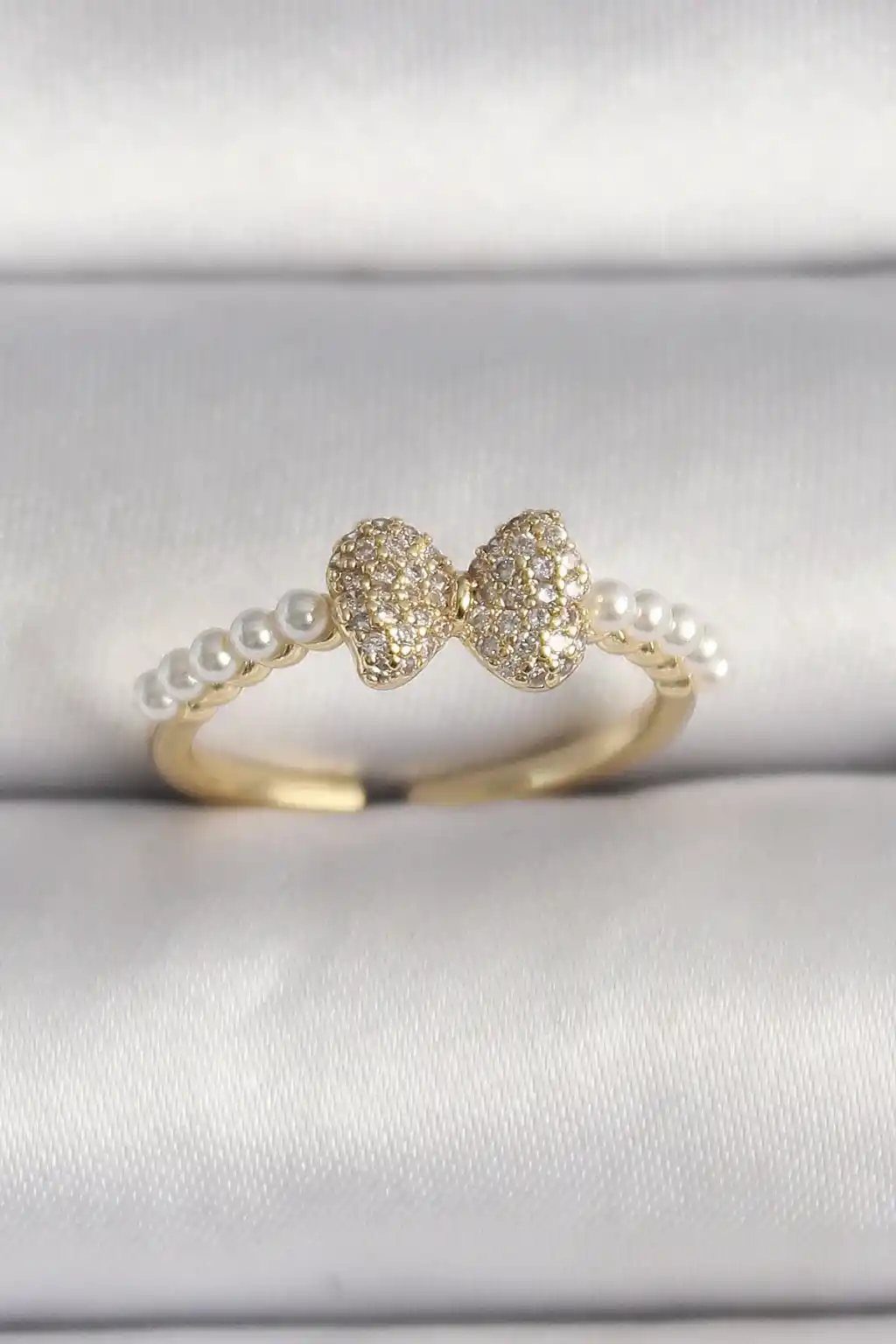 Pirinç Gold Renk Zirkon Taşlı Fiyonk İnci Detay Ayarlanabilir Yüzük