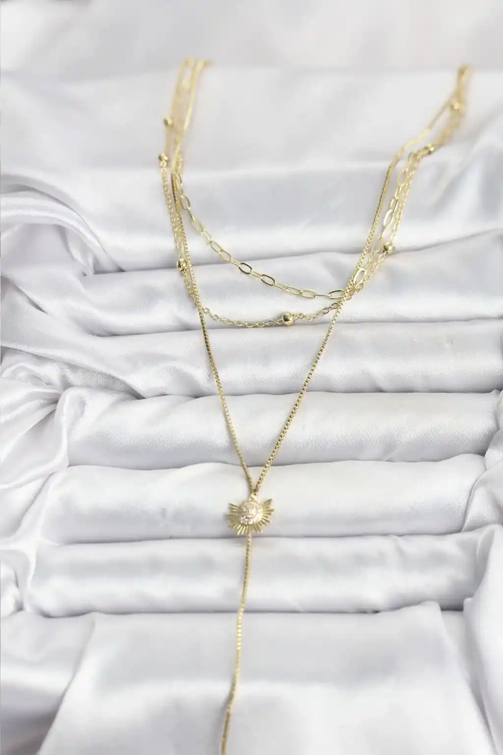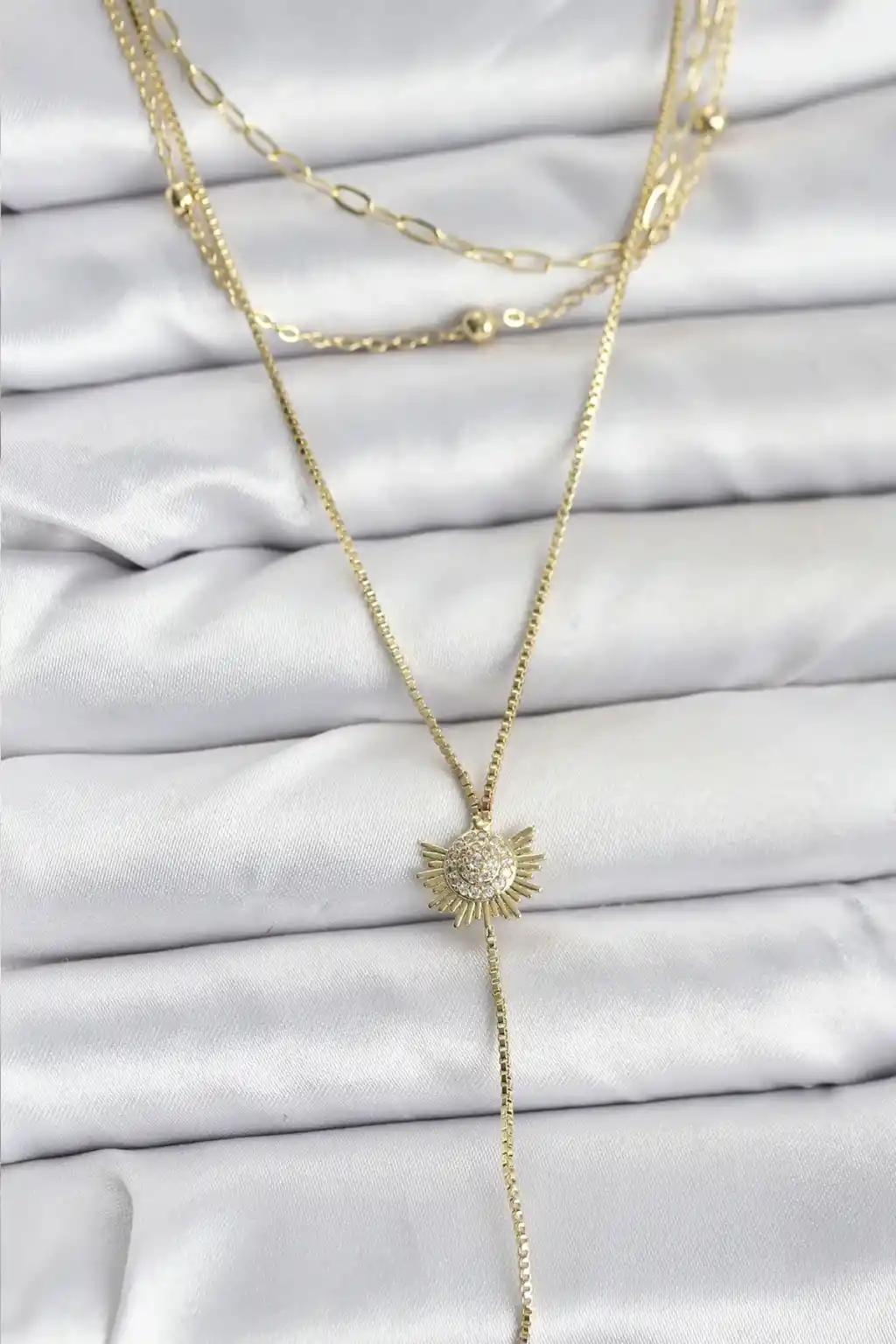 Pirinç Gold Renk Zirkon Taşlı Güneş Model Detaylı 3'lü Kombin Y Kadın Kolye