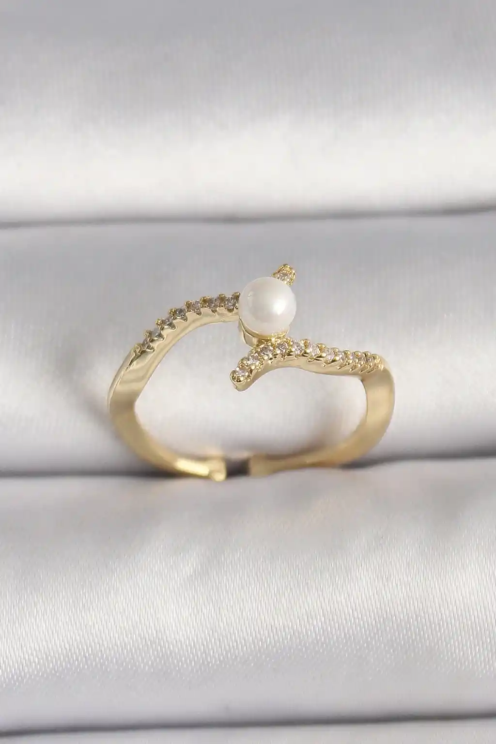 Pirinç Gold Renk Zirkon Taşlı İncili Ayarlanabilir Yüzük