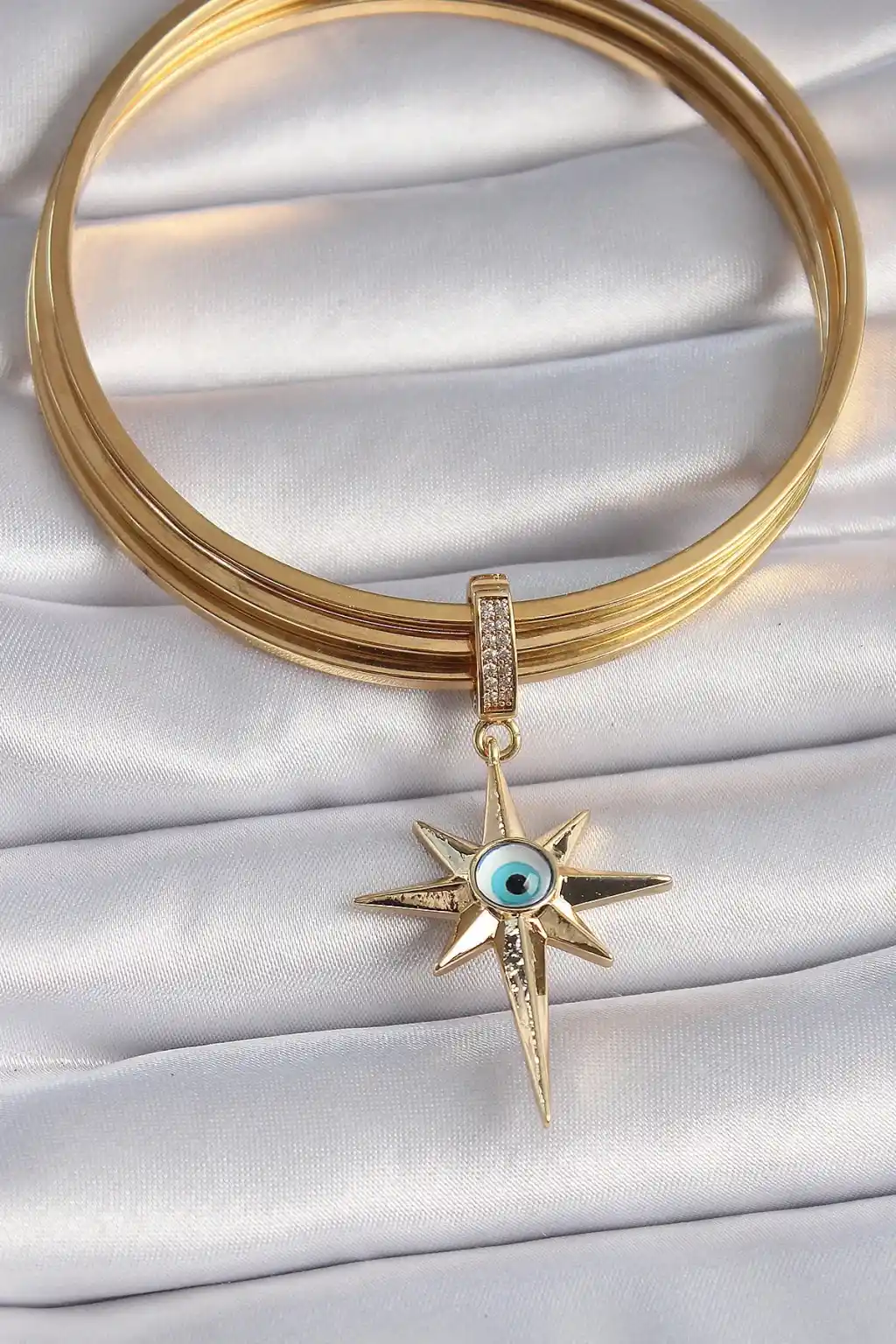 Pirinç Gold Renk Zirkon Taşlı Kutup Yıldızı Nazar Boncuk Detay Ajda Charm