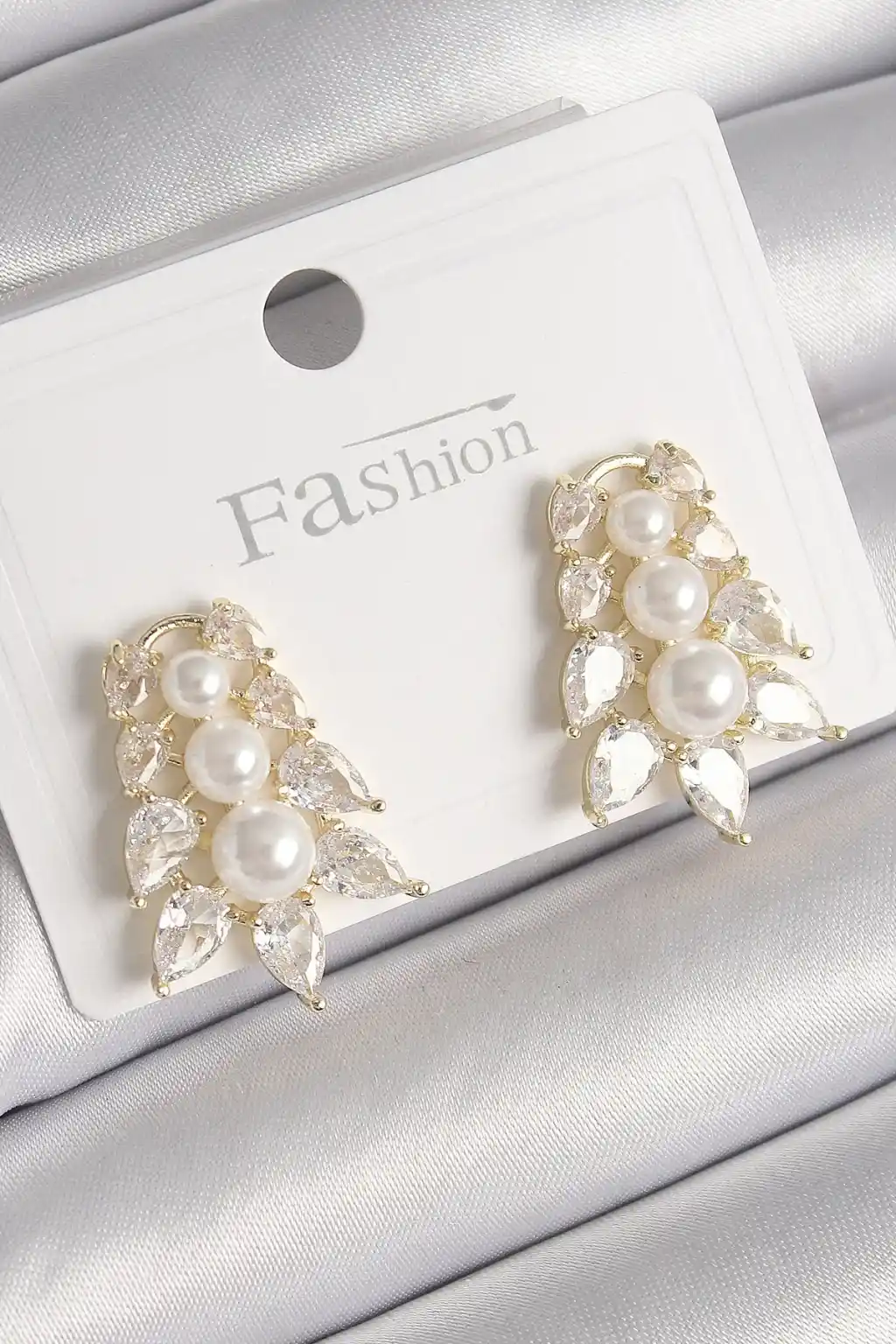 Pirinç Gold Renk Zirkon Taşlı Yaprak Model İnci Detay Kadın Küpe