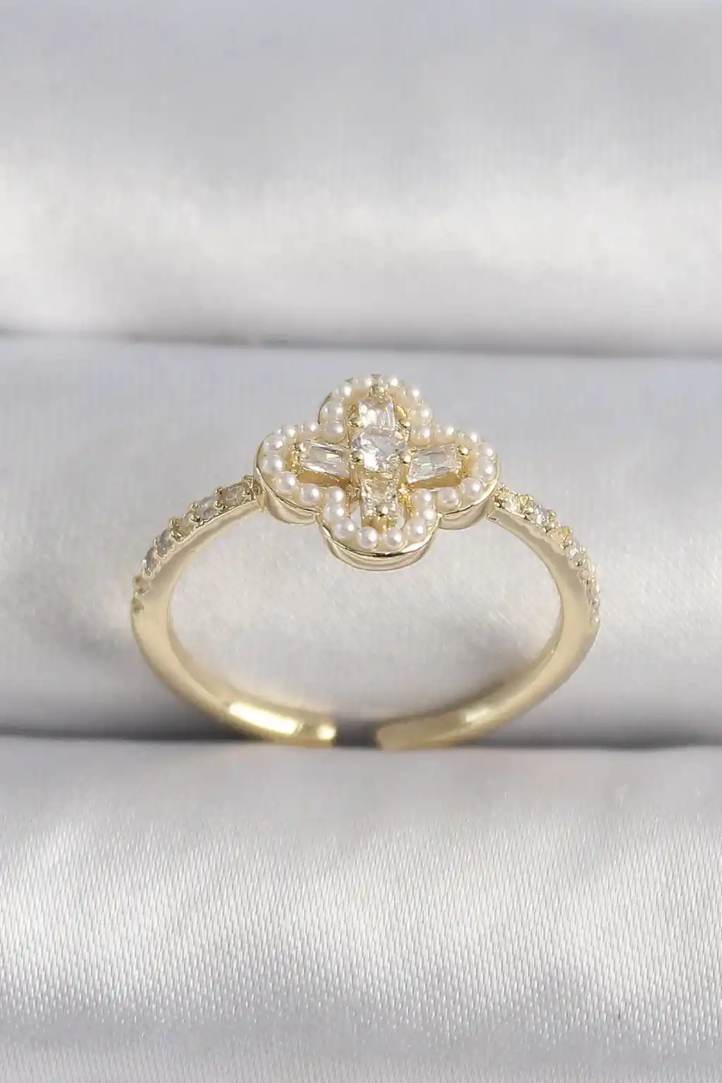 Pirinç Gold Renk Zirkon Taşlı Yonca Model İnci Detay Kadın Yüzük