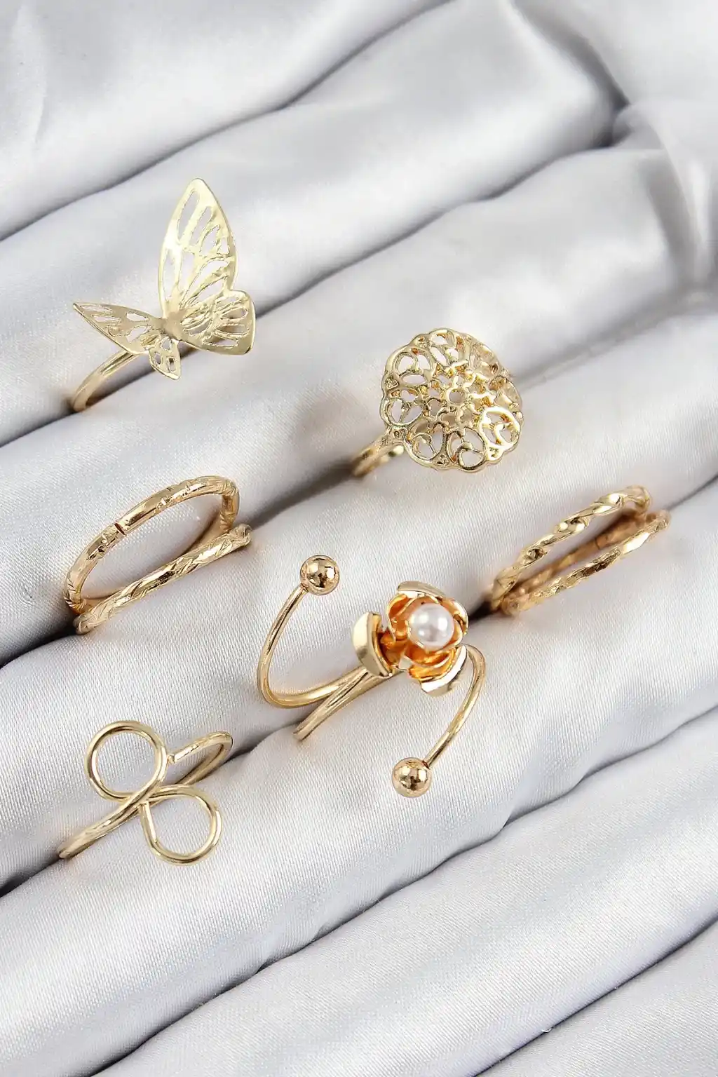 Pirinç Gül Kelebek Model Gümüş Renk Kadın Yüzük Kombin Set