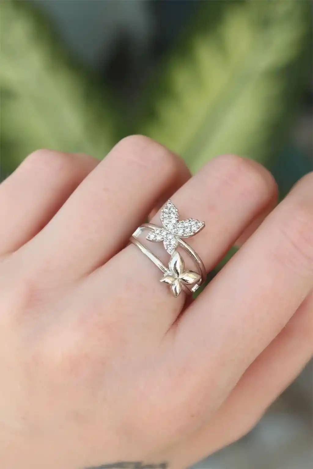 Pirinç Gümüş Renk Ayarlanabilir Zirkon Taşlı Kelebek Yüzük