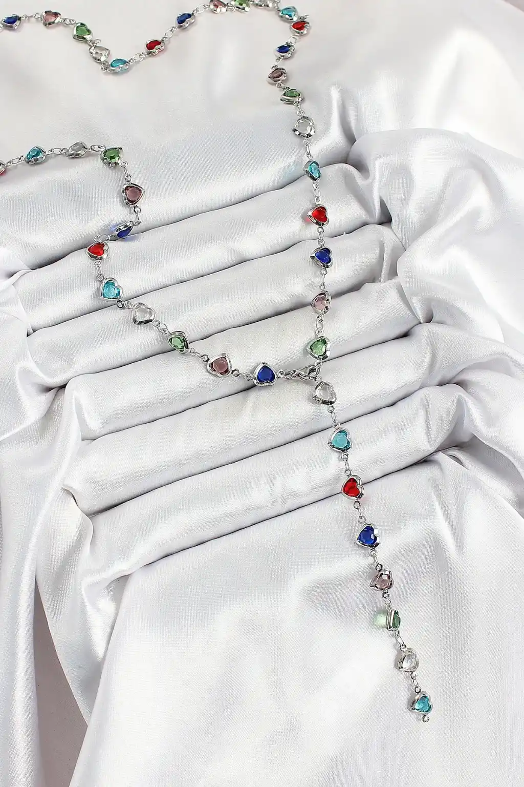 Pirinç Gümüş Renk Karışık Renk Zirkon Taşlı Kalpli Y Kadın Kolye