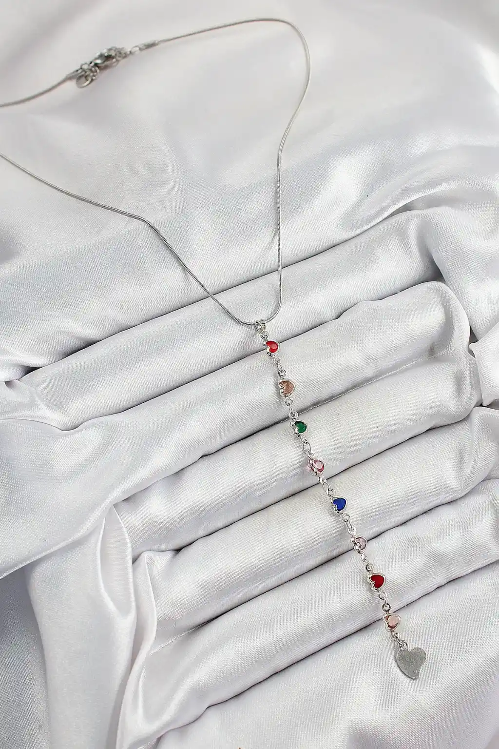 Pirinç Gümüş Renk Karışık Renk Zirkon Taşlı Kalpli Y Kadın Kolye