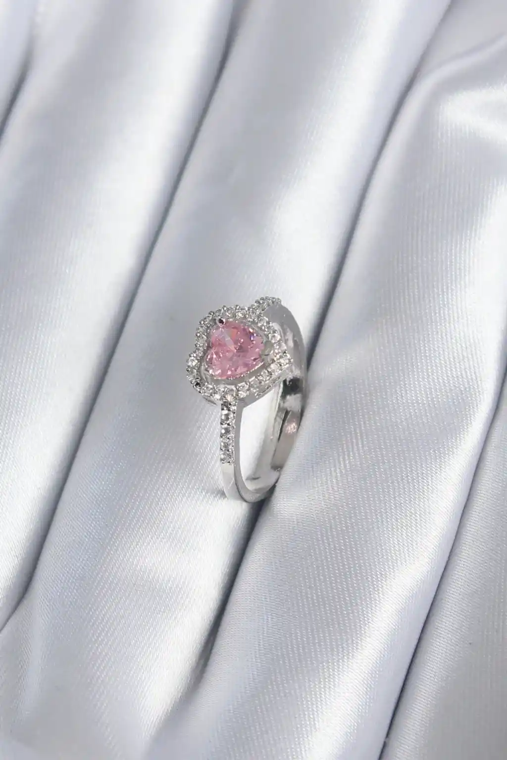 Pirinç Gümüş Renk Pembe Zirkon Taş Kalp Charm Model Kadın Yüzük
