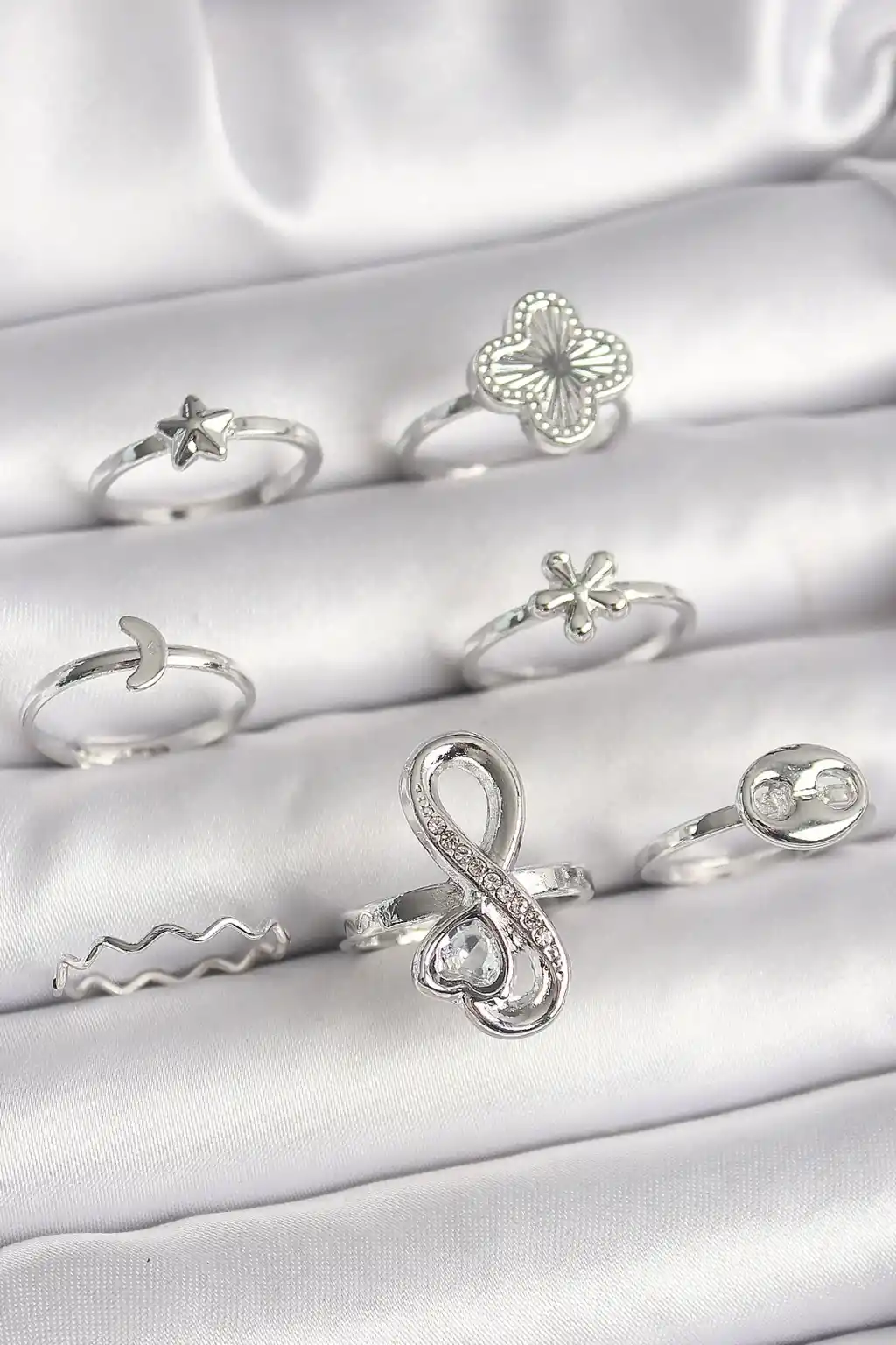 Pirinç Gümüş Renk Yonca Figür Sonsuzluk Zirkon Taşlı Kalp Detay Kadın Yüzük Kombini