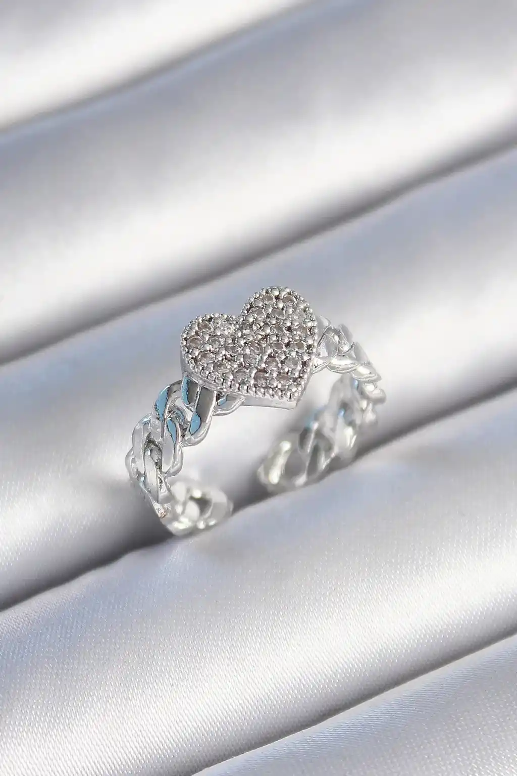 Pirinç Gümüş Renk Zincir Kordon Zirkon Taşlı Kalp Model Kadın Yüzük