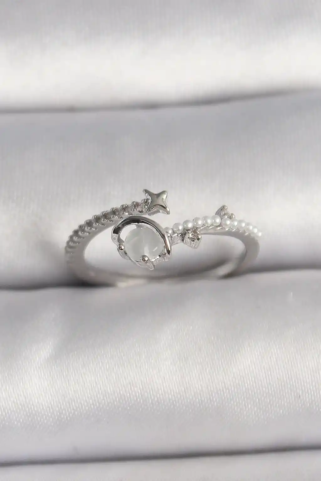 Pirinç Gümüş Renk Zirkon Taşlı Beyaz Mineli Yıldız Detay Ayarlanabilir Kadın Yüzük