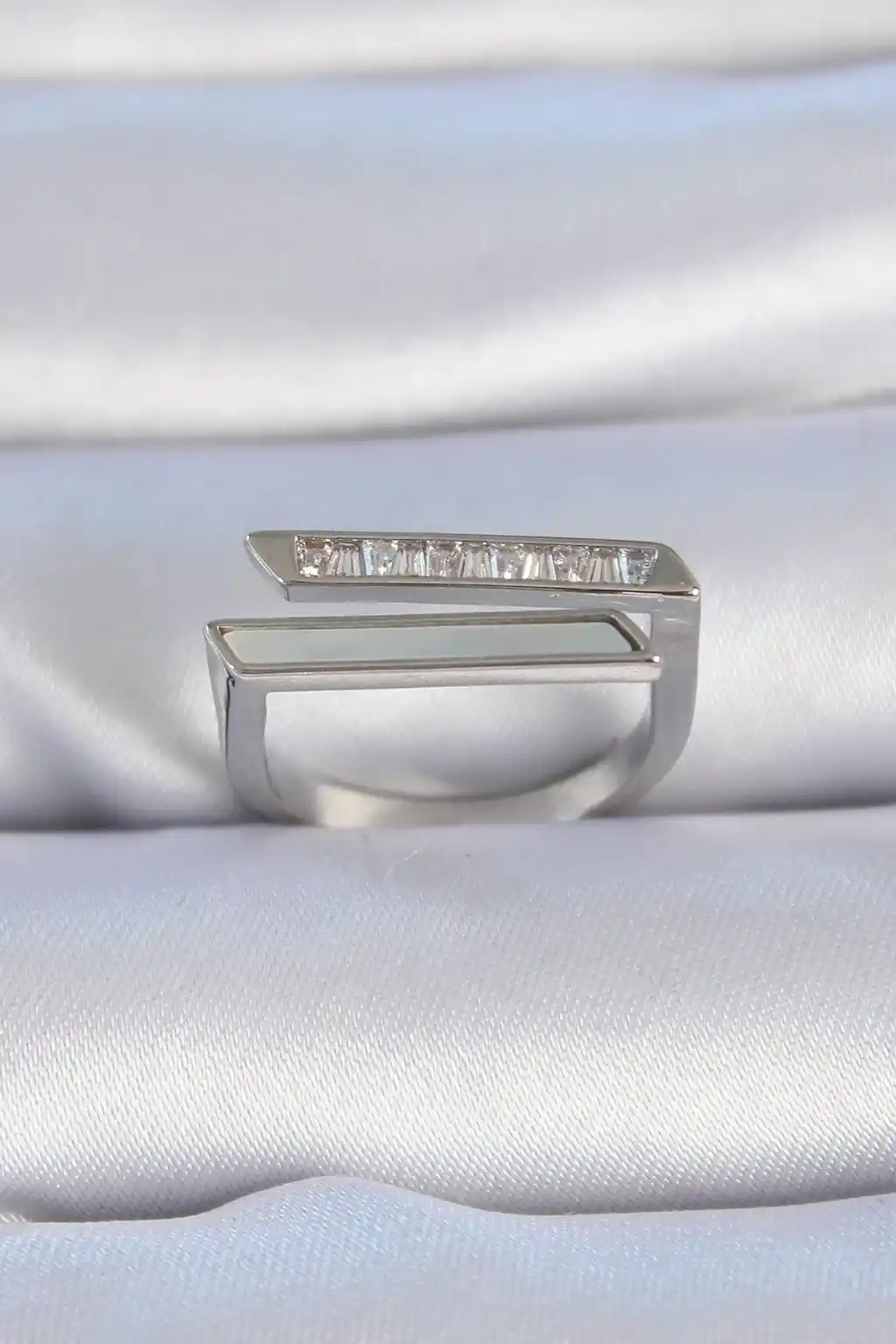 Pirinç Gümüş Renk Zirkon Taşlı Beyaz Sedef Detay Kadın Yüzük