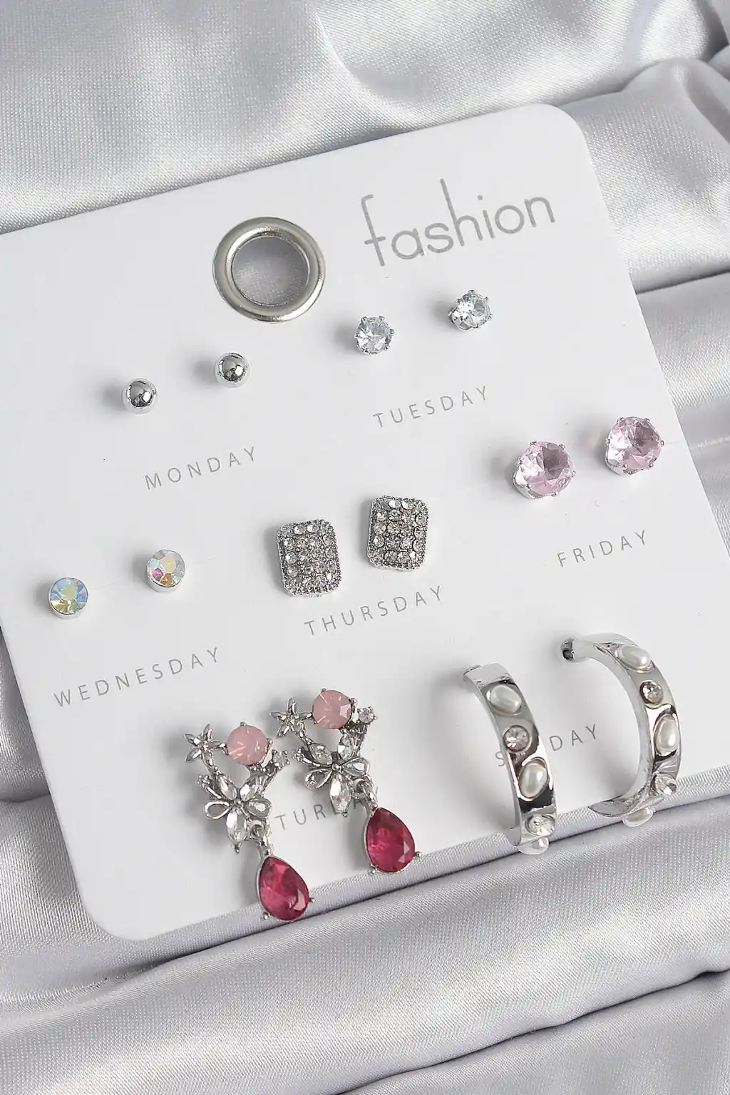 Pirinç Gümüş Renk Zirkon Taşlı Çiçek Figür İncili Halka Detay 7 Çift Kadın Küpe Seti