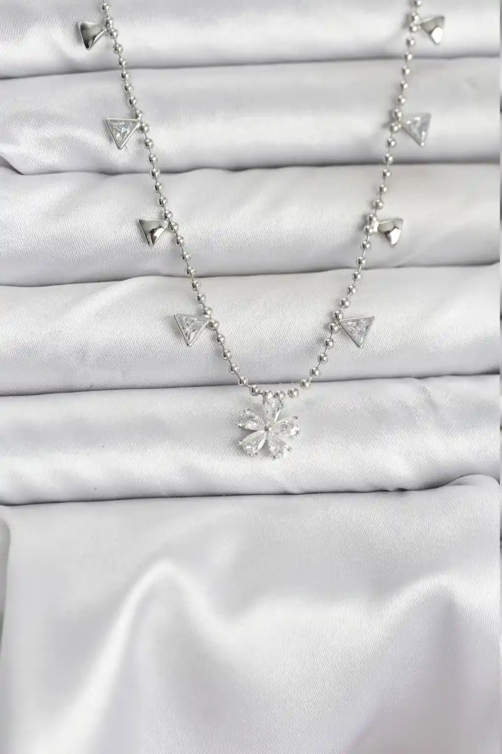 Pirinç Gümüş Renk Zirkon Taşlı Çiçek Model Kadın Kolye