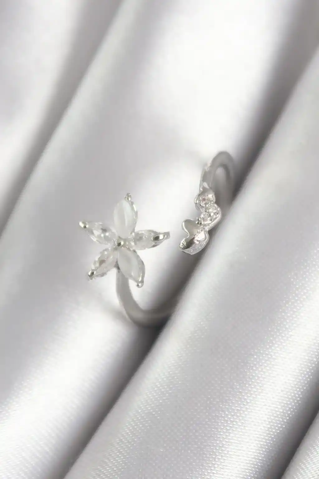 Pirinç Gümüş Renk Zirkon Taşlı Çiçek Model Kalp Detay Kadın Yüzük