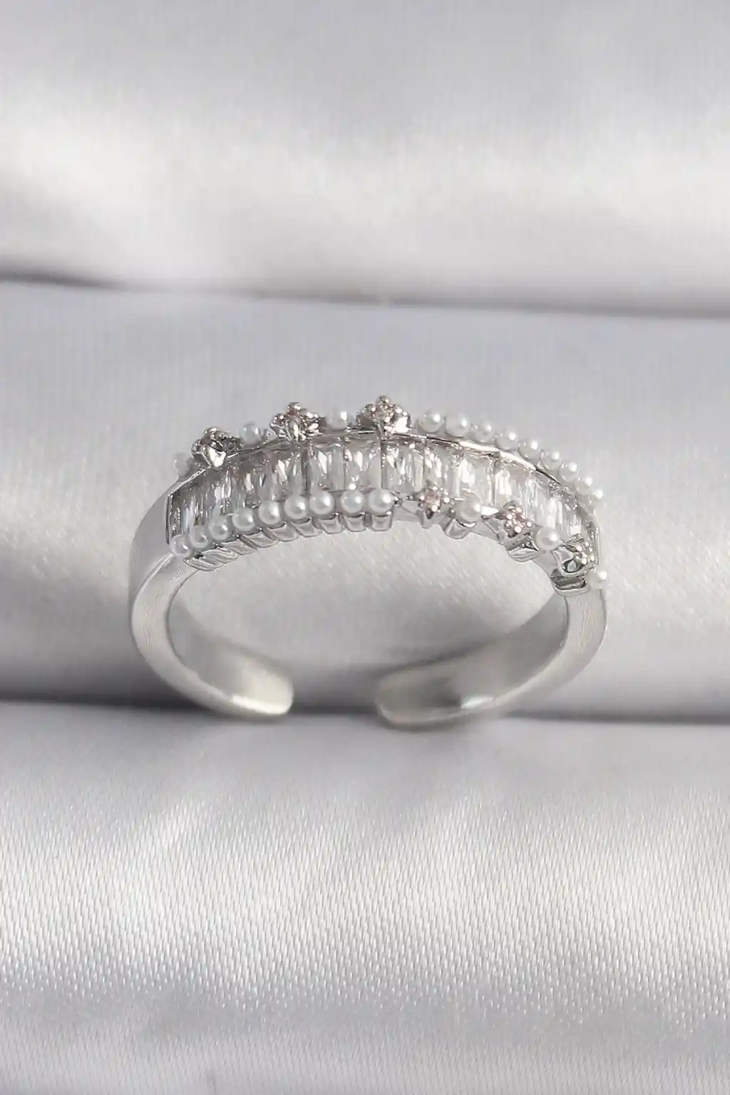 Pirinç Gümüş Renk Zirkon Taşlı İnci Detay VIP Seri Kadın Yüzük