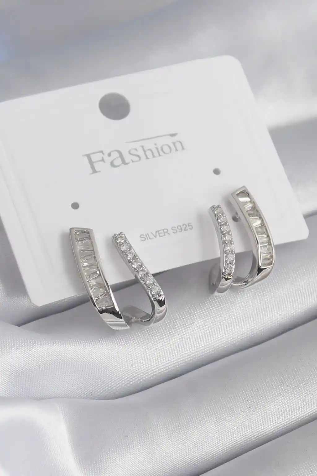 Pirinç Gümüş Renk Zirkon Taşlı Kadın Küpe