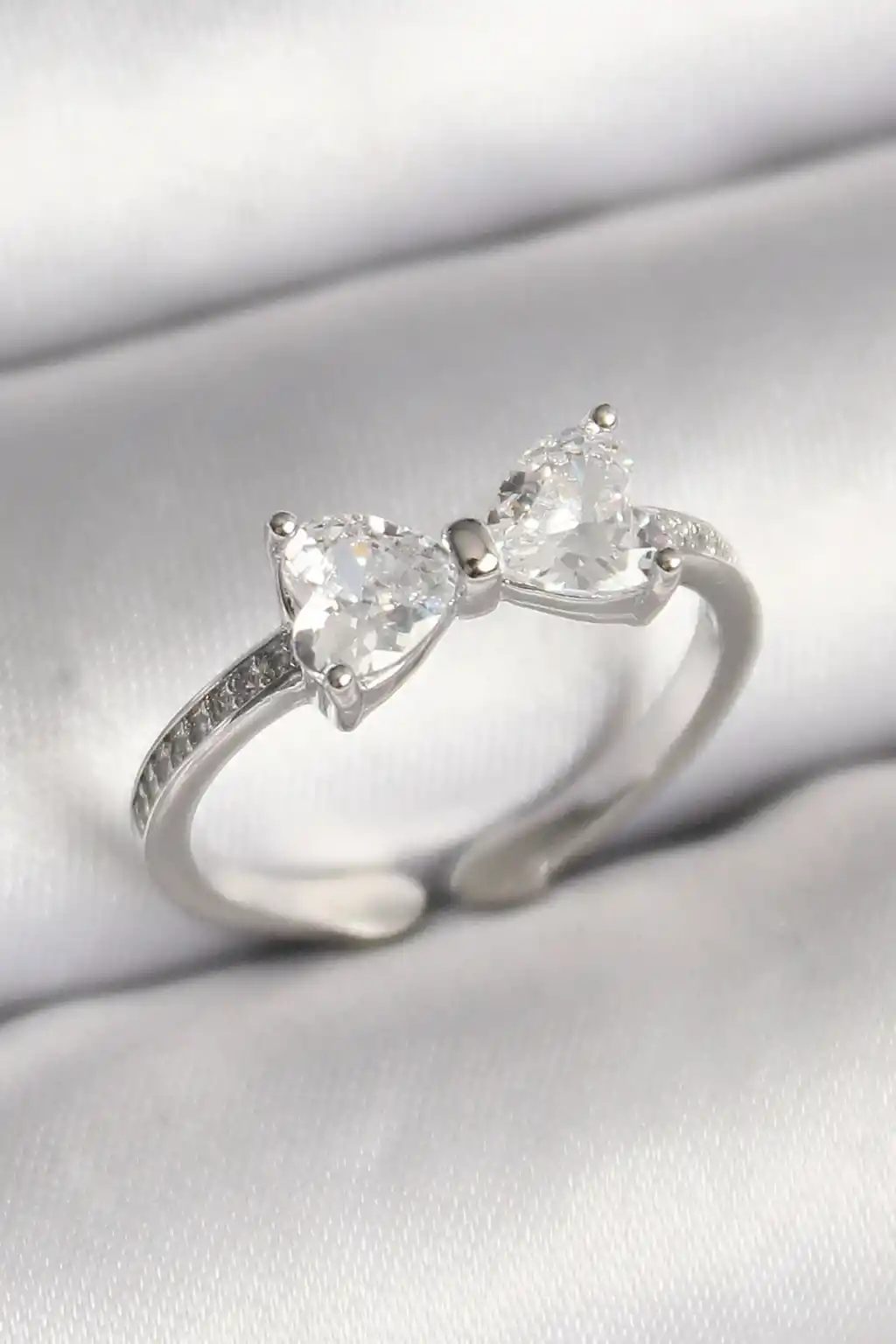 Pirinç Gümüş Renk Zirkon Taşlı Kalp Fiyonk Model Kadın Yüzük
