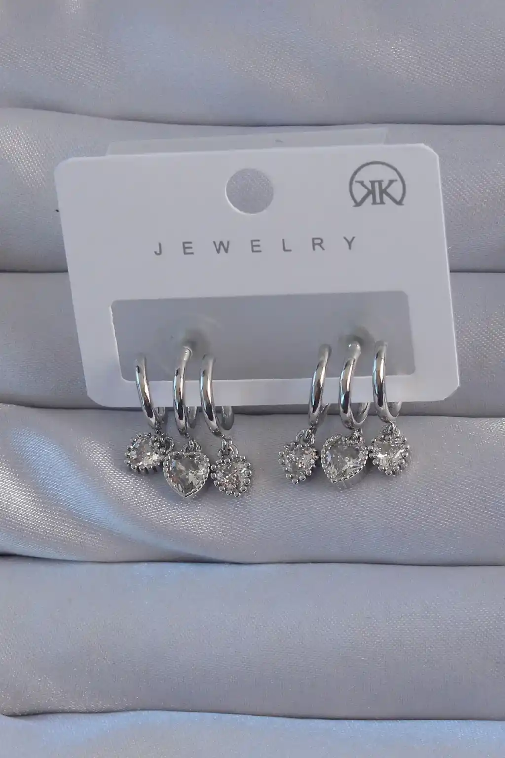 Pirinç Gümüş Renk Zirkon Taşlı Kalp Model Çoklu Görünüm Yarım Halka Küpe