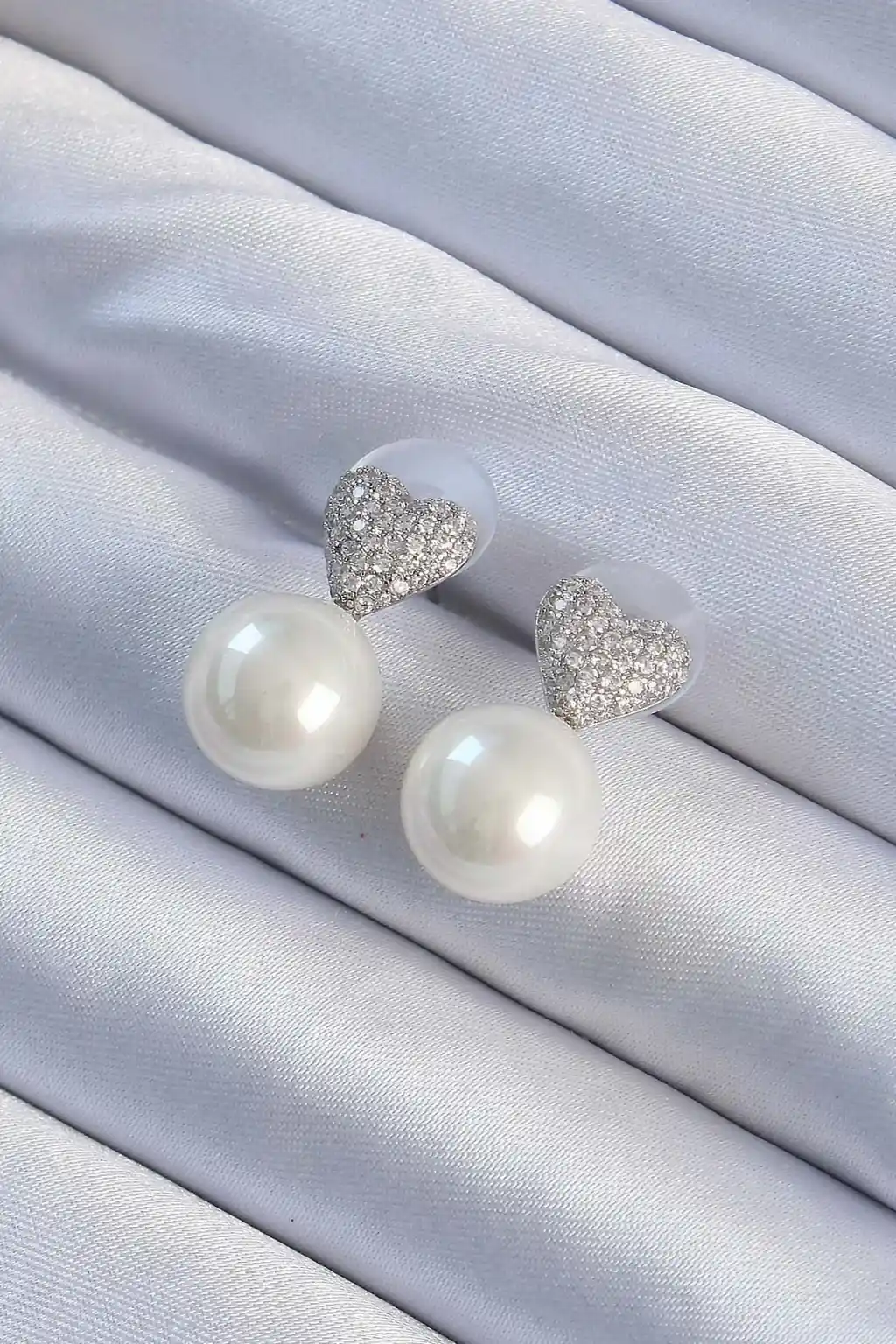 Pirinç Gümüş Renk Zirkon Taşlı Kalp Model İnci Tasarım Kadın Küpe