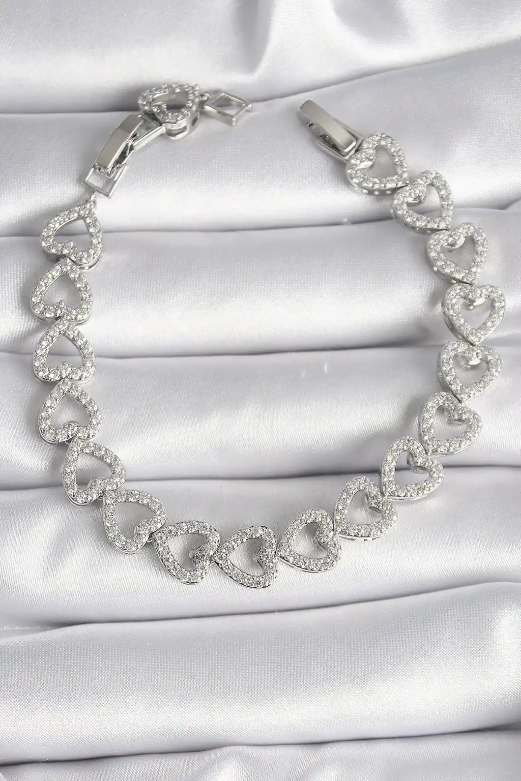 Pirinç Gümüş Renk Zirkon Taşlı Kalp Model VIP Seri Kadın Bileklik