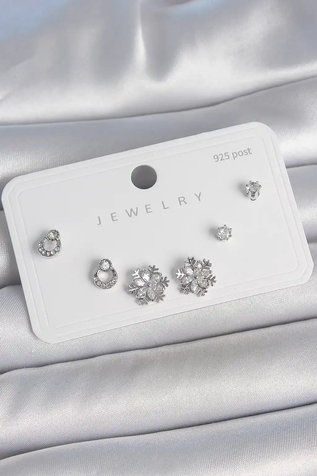 Pirinç Gümüş Renk Zirkon Taşlı Kar Tanesi Model 925 Ayar Gümüş Çivi Kadın Küpe Seti
