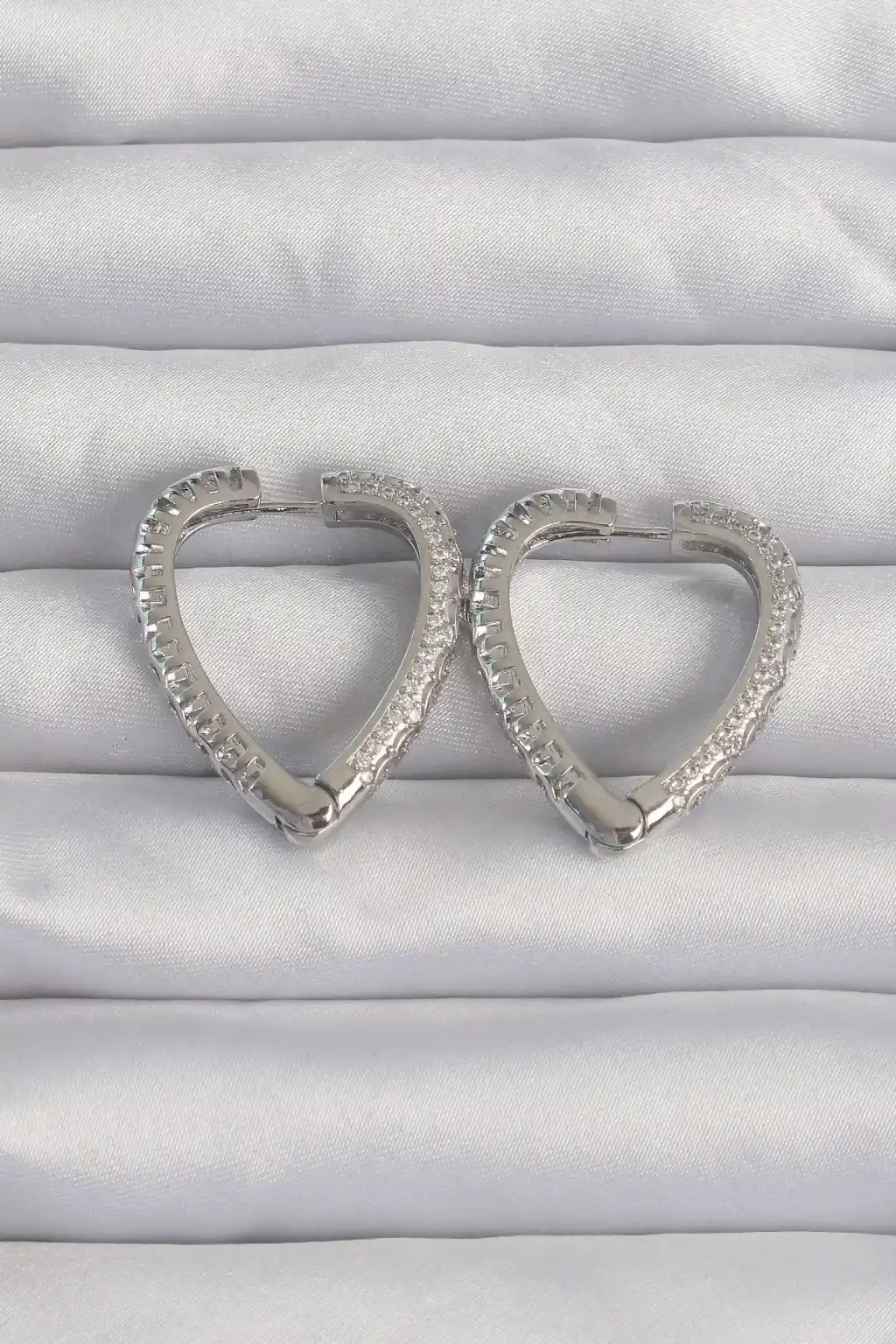 Pirinç Gümüş Renk Zirkon Taşlı Motifli Kalp Küpe