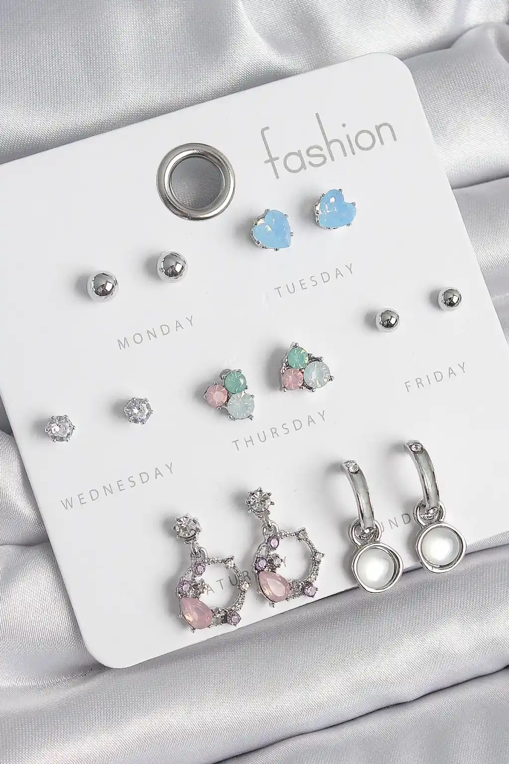 Pirinç Gümüş Renk Zirkon Taşlı Sallantı Halka Model Çiçek Detay 7 Çift Kadın Küpe Seti