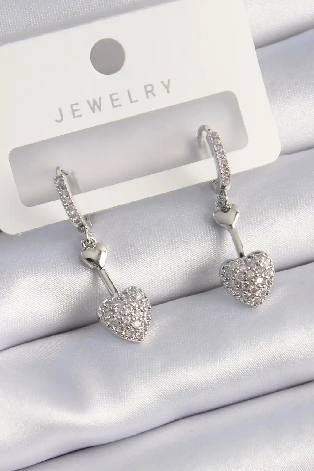 Pirinç Gümüş Renk Zirkon Taşlı Sallantı Kalp Model Kadın Küpe