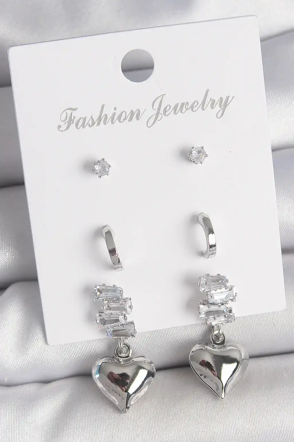 Pirinç Gümüş Renk Zirkon Taşlı Sallantılı Kalp Model Yarım Halka Detay 3 Çfit Kadın Küpe Seti