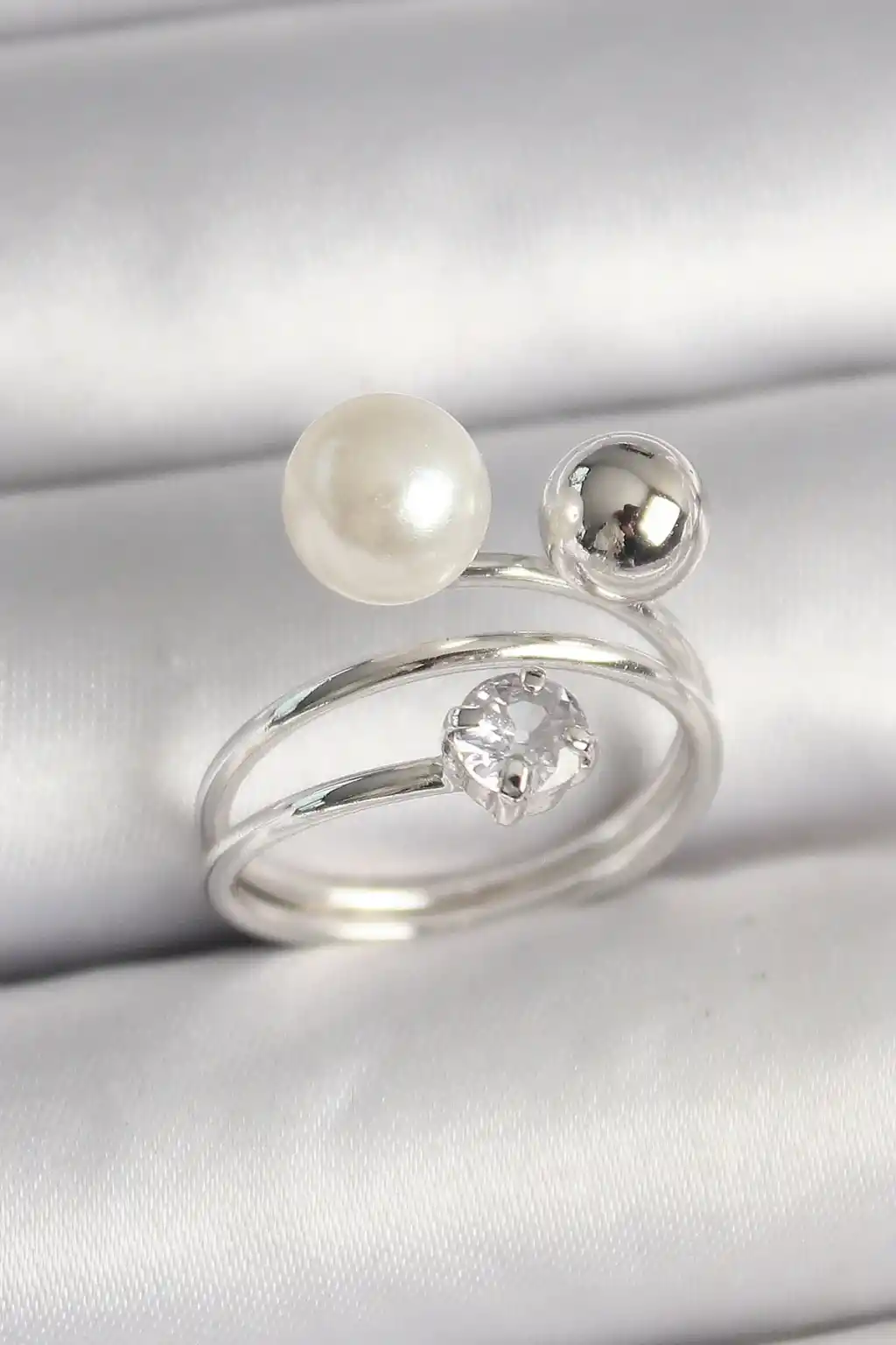 Pirinç Gümüş Renk Zirkon Taşlı Toplu İnci Model Kadın Yüzük