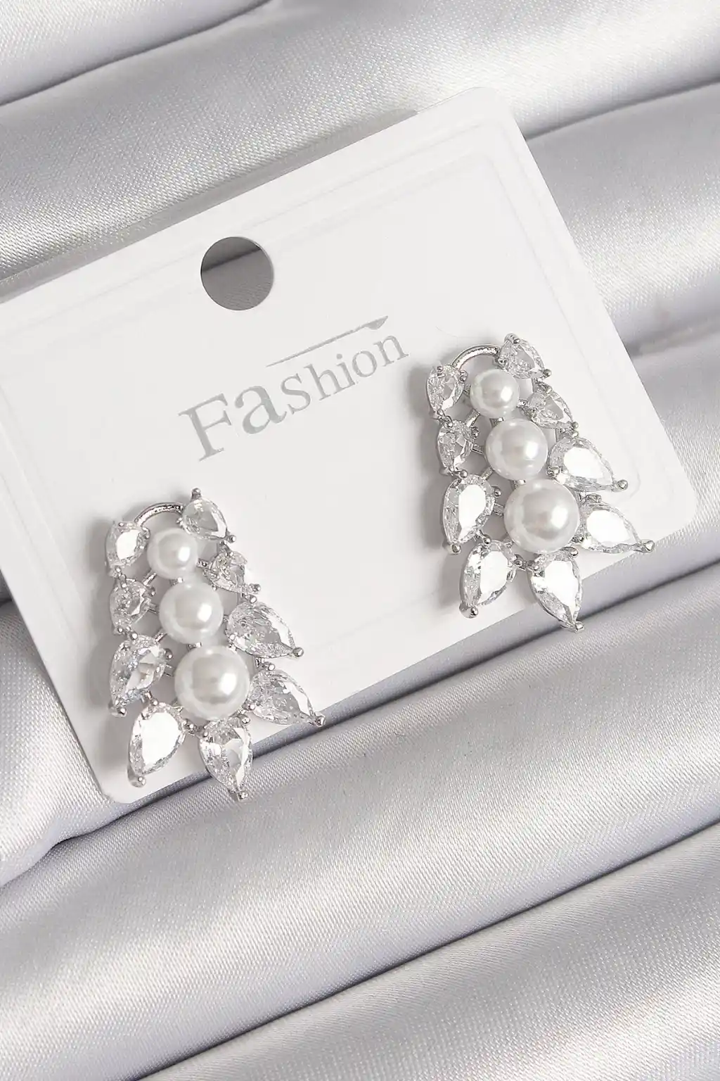 Pirinç Gümüş Renk Zirkon Taşlı Yaprak Model İnci Detay Kadın Küpe