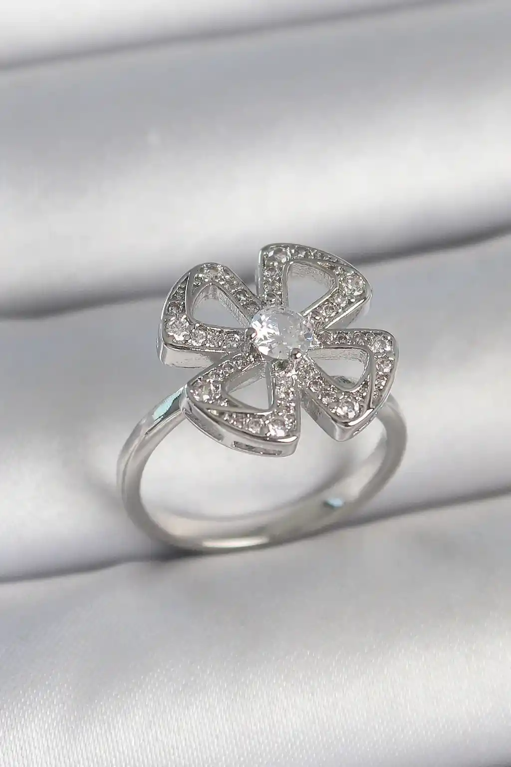 Pirinç Gümüş Renk Zirkon Taşlı Yonca Model Ayarlanabilir Kadın Yüzük