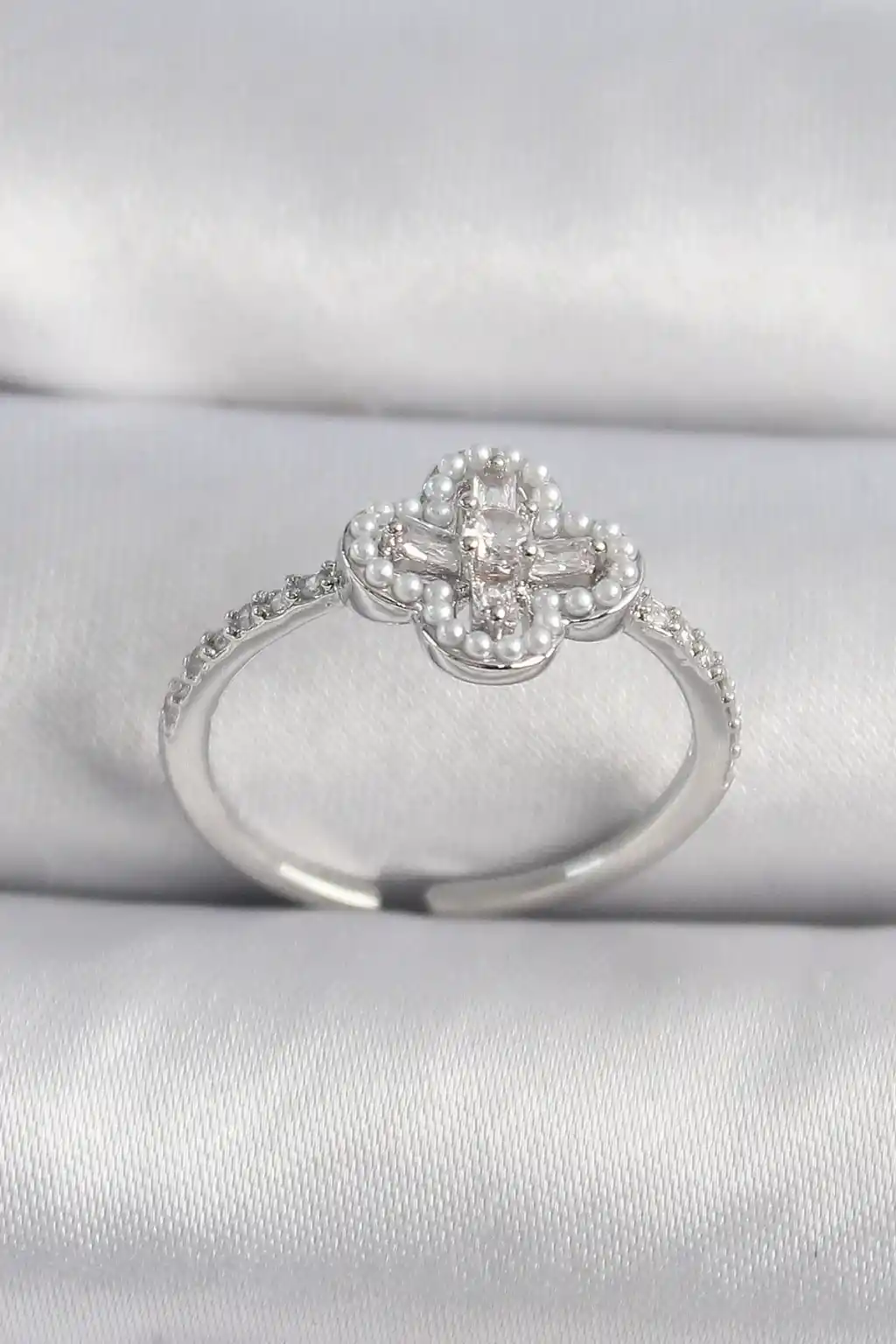Pirinç Gümüş Renk Zirkon Taşlı Yonca Model İnci Detay Kadın Yüzük