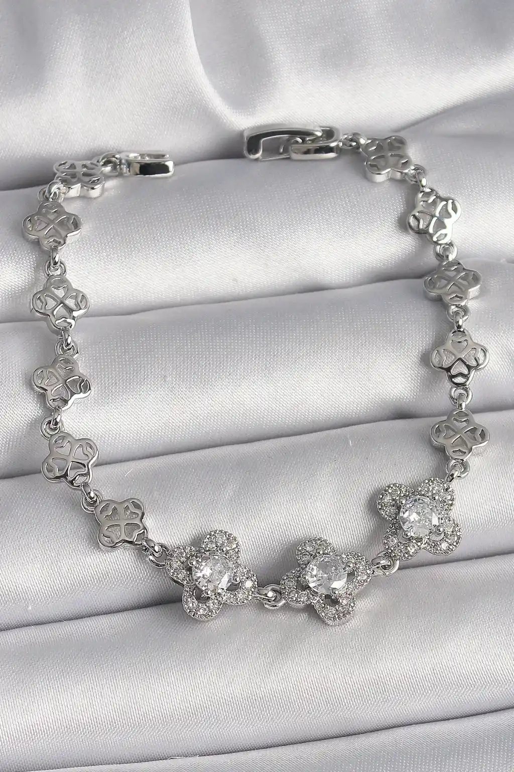Pirinç Gümüş Renk Zirkon Taşlı Yonca Model Kadın Bileklik