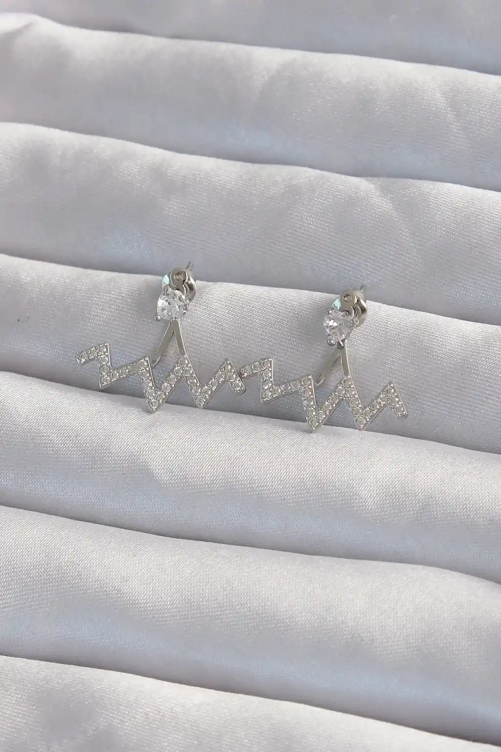 Pirinç Gümüş Renk Zirkon Taşlı Zikzak Küpe