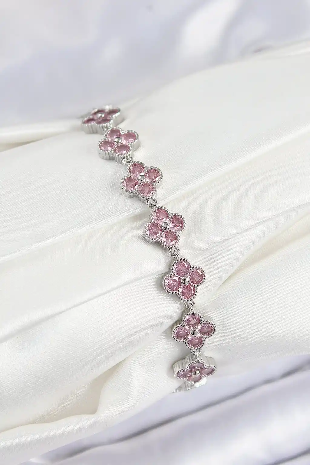 Pirinç Pembe Zirkon Taşlı Yonca Model Gümüş Renk VIP Seri Kadın Bileklik