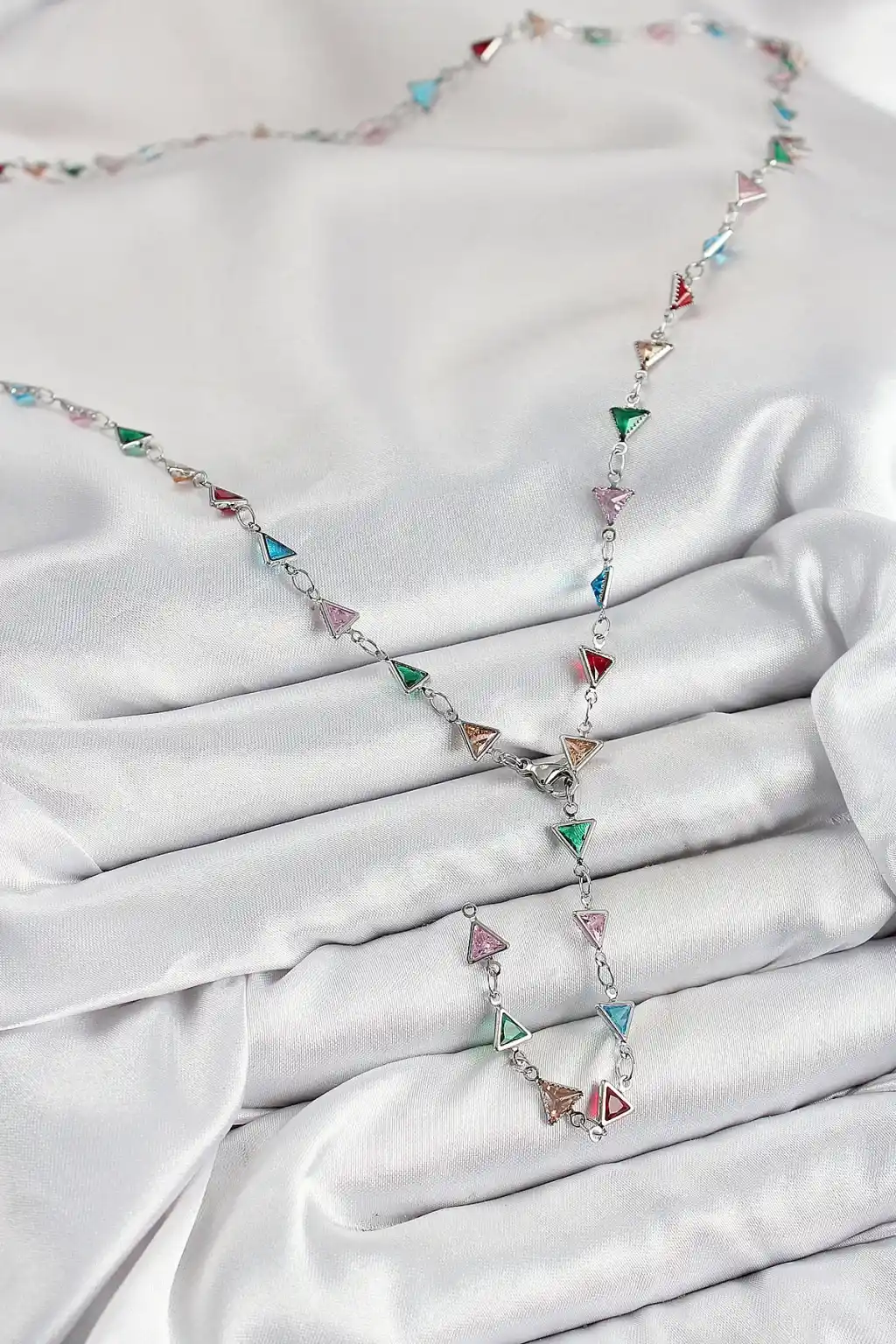 Pirinç Renkli Zirkon Taşlı Üçgen Model Gümüş Renk Kadın Y Kolye