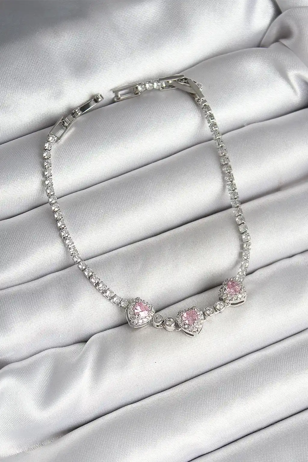 Pirinç Sıralı Pembe Kalp Figürlü Zirkon Taşlı Gümüş Renk Kadın Bileklik