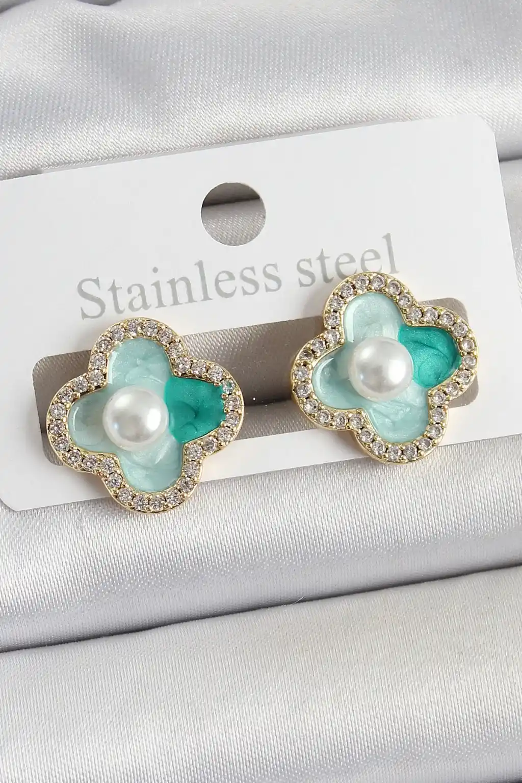 Pirinç Yeşil Mineli İnci Detaylı Zirkon Taşlı Sanatsal Portre Yonca Model Gold Renk Kadın Küpe