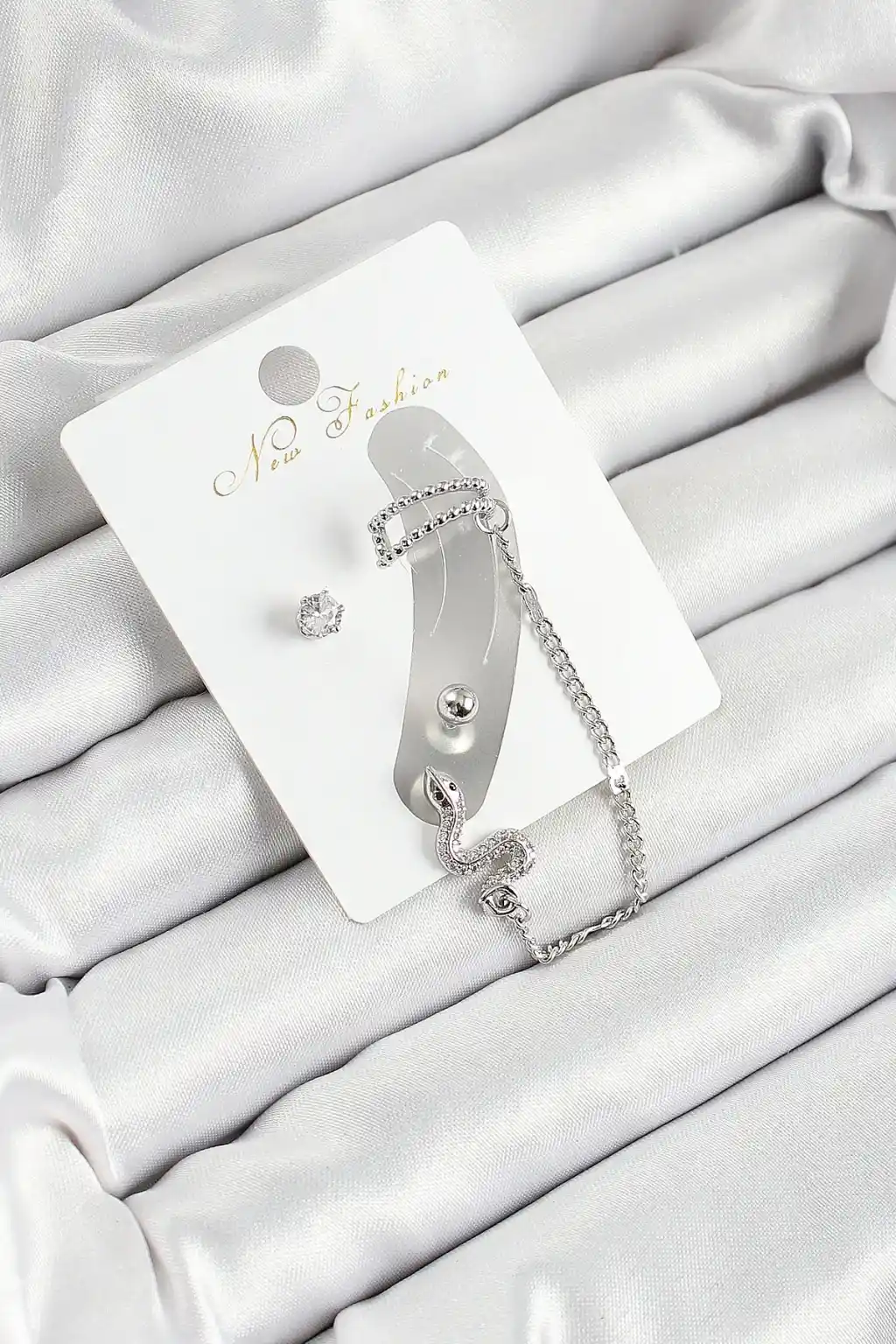 Pirinç Yılan Figürlü Zirkon Taşlı Gümüş Renk 3'lü Kıkırdak Kadın Küpe Set