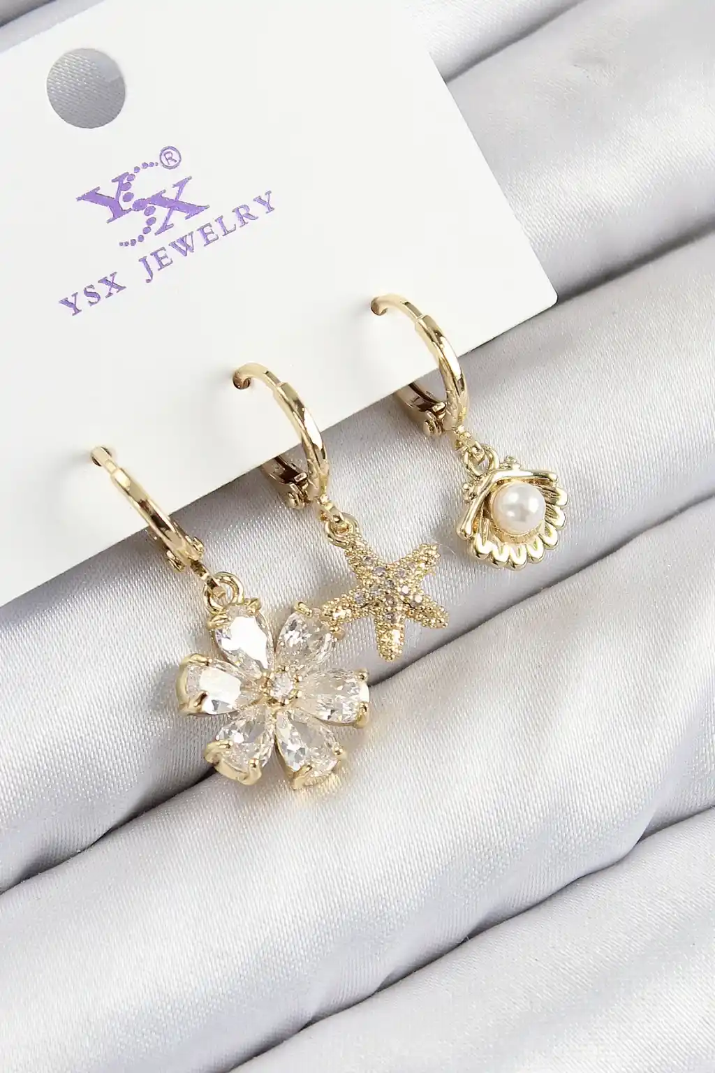 Pirinç Zirkon Taşlı 3'lü İstiridye Ve Çiçek Model Gold Renk Kadın Küpe