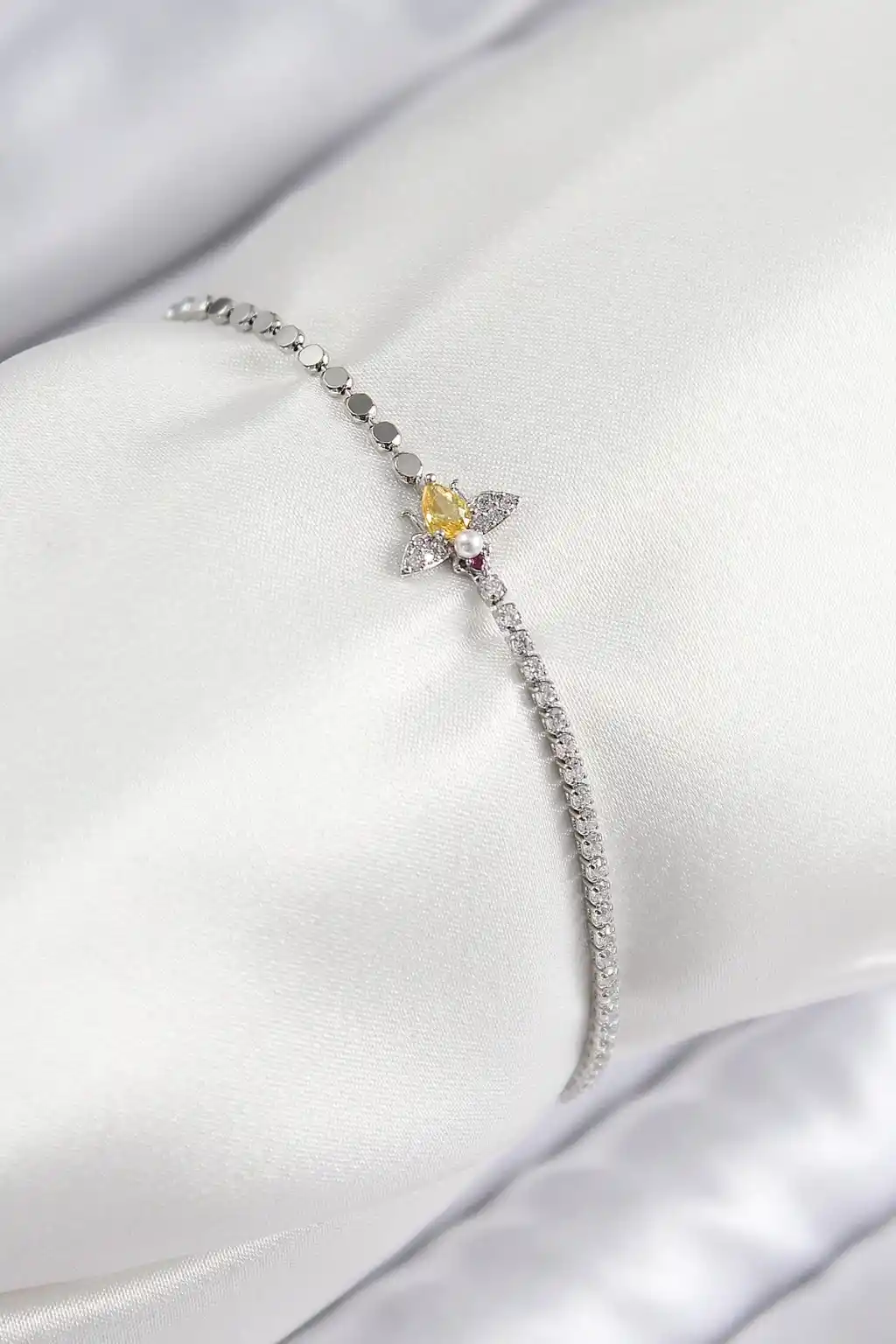 Pirinç Zirkon Taşlı Arı Model Ezme Zincir Gümüş Renk Kadın Bileklik