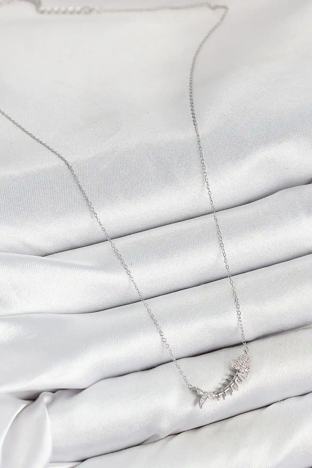 Pirinç Zirkon Taşlı Balık Kılçığı Model Gümüş Renk Kadın Kolye
